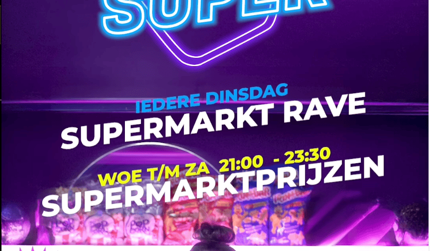 Iedere dinsdag gaat de Supermarkt pas om 23:00 uur open, een speciale koopavond waarbij we de Supermarktrave lanceren! Er is slechts plek voor 50 man die 4 uur lang mogen raven in onze supermarkt tegen supermarktprijzen! Alleen toegang op vertoon van je studentenpas.